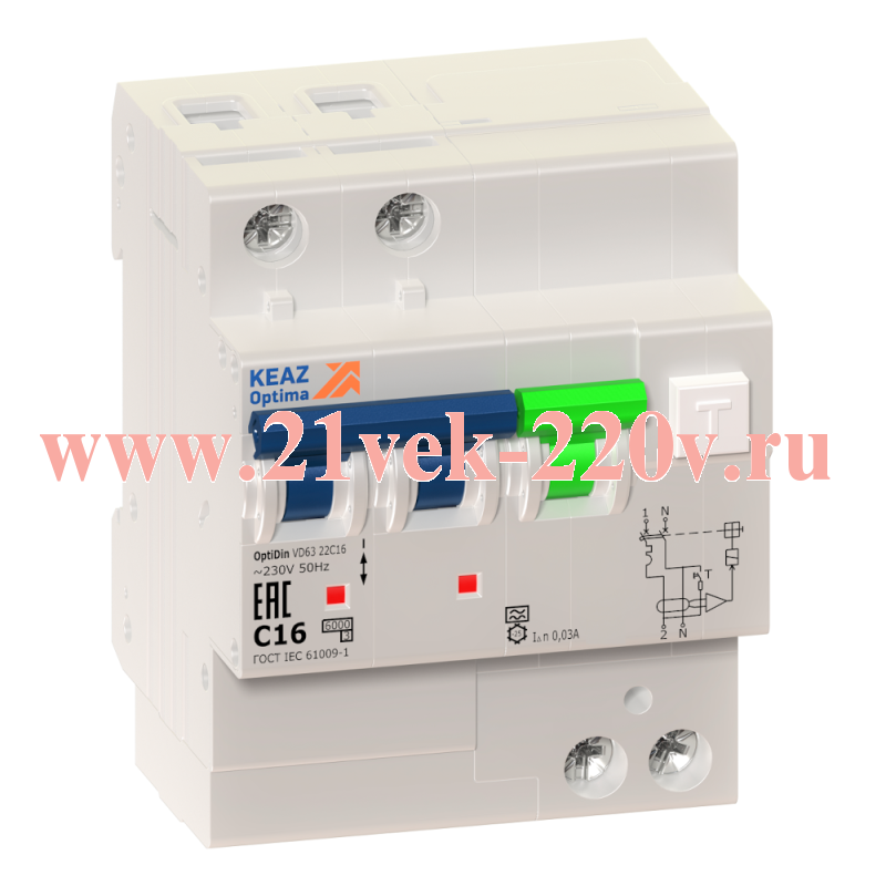 Автоматические выключатели типа OptiDin VD63, управляемые дифференциальным током со встроенной защитой от сверх токов (АВДТ), устанавливаются в электрических цепях переменного тока частоты 50 Гц с глухозаземленной нейтралью номинальным напряжением не выше 400 В и номинальными токами до 63 А и предназначены для защиты людей от поражения электрическим током при неисправностях электрооборудования или при непреднамеренном контакте с открытыми проводящими частями электроустановок, для предотвращения возгораний и пожаров, возникающих вследствие протекания токов утечки и замыканий на землю, а также для защиты от перегрузки и короткого замыкания. АВДТ относятся к классу устройств, функционально зависящих от напряжения сети (не размыкающихся автоматически в случае исчезновения напряжения). Двухполюсные АВДТ предназначены для стационарной установки при неподвижной проводке в нормальных и жёстких условиях эксплуатации по ГОСТ 30345.0-95 в однофазных, а четырёхполюсные — в трёхфазных. АВДТ соответствуют требованиям ГОСТ IEC 61009-1, ТР ТС 004/2011, ТР ТС 020/2011 и изготавливаются по ТУ3422-046-05758109-2008.
