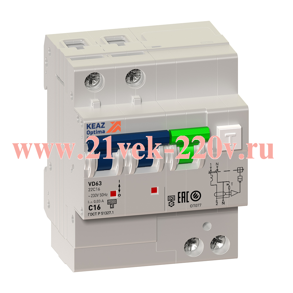 Автоматические выключатели типа OptiDin VD63, управляемые дифференциальным током со встроенной защитой от сверх токов (АВДТ), устанавливаются в электрических цепях переменного тока частоты 50 Гц с глухозаземленной нейтралью номинальным напряжением не выше 400 В и номинальными токами до 63 А и предназначены для защиты людей от поражения электрическим током при неисправностях электрооборудования или при непреднамеренном контакте с открытыми проводящими частями электроустановок, для предотвращения возгораний и пожаров, возникающих вследствие протекания токов утечки и замыканий на землю, а также для защиты от перегрузки и короткого замыкания. АВДТ относятся к классу устройств, функционально зависящих от напряжения сети (не размыкающихся автоматически в случае исчезновения напряжения). Двухполюсные АВДТ предназначены для стационарной установки при неподвижной проводке в нормальных и жёстких условиях эксплуатации по ГОСТ 30345.0-95 в однофазных, а четырёхполюсные — в трёхфазных. АВДТ соответствуют требованиям ГОСТ IEC 61009-1, ТР ТС 004/2011, ТР ТС 020/2011 и изготавливаются по ТУ3422-046-05758109-2008.
