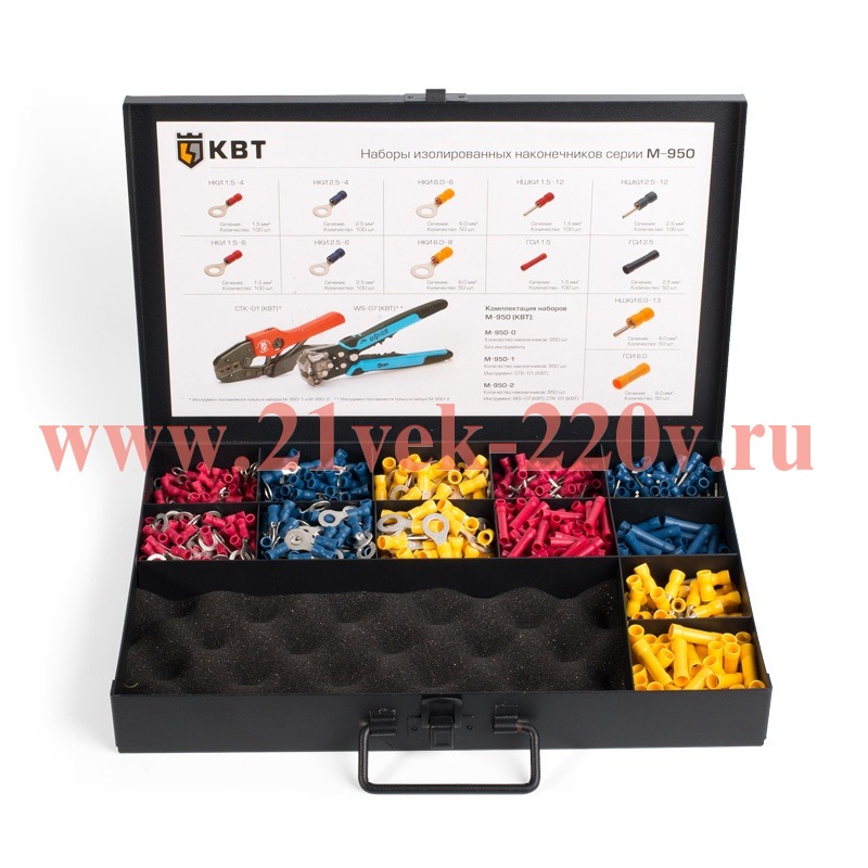 Набор изолированных наконечников и гильз М-950-0 в металлическом кейсе SKU, М-950-0, КВТ. Оконцевание и соединение опрессовкой медных проводов сечениями от 0.25 до 6 мм2.