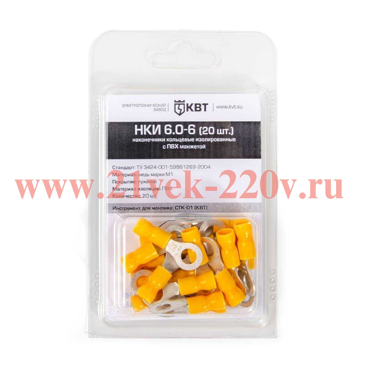 Наконечник кабельный кольцевой изолированный НКИ 6.0–6 (20 шт) с ПВХ изоляцией в мини-упаковке SKU, НКИ 6.0–6 (20 шт.). Оконцевание опрессовкой многопроволочных гибких медных проводов сечениями от 2.5 до 6 мм2 и последующий крепеж наконечников к клеммам электрического оборудования крепежным болтом М6.