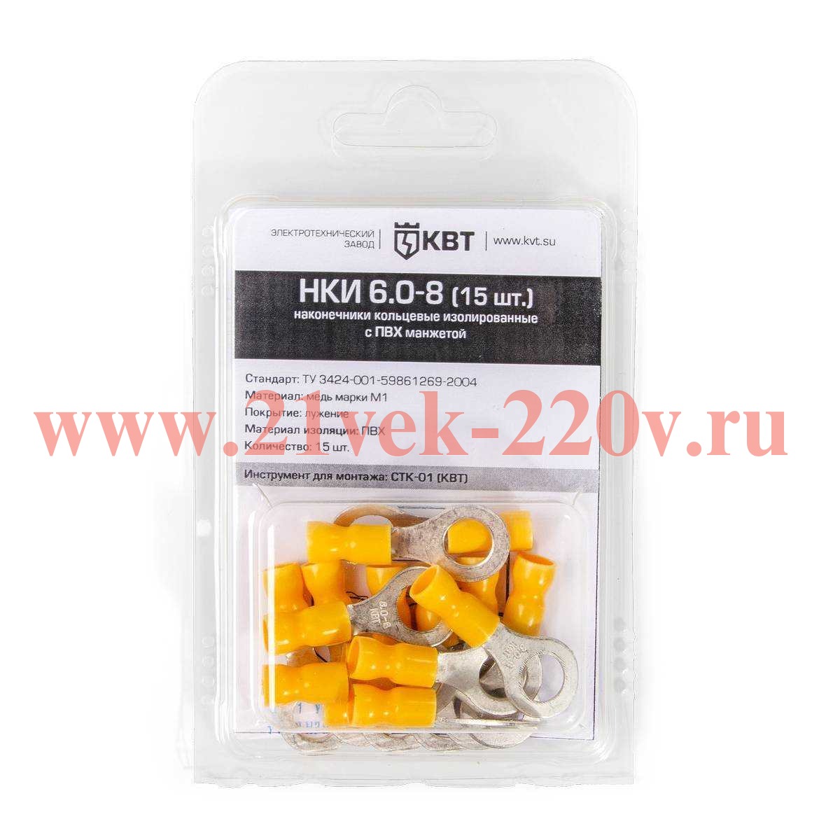 Наконечник кабельный кольцевой изолированный НКИ 6.0–8 (15 шт) с ПВХ изоляцией в мини-упаковке SKU, НКИ 6.0–8 (15 шт.). Оконцевание опрессовкой многопроволочных гибких медных проводов сечениями от 2.5 до 6 мм2 и последующий крепеж наконечников к клеммам электрического оборудования крепежным болтом М8.