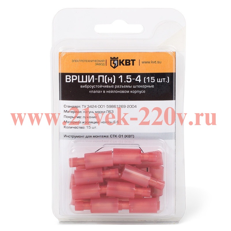 Разъём штекерный изолированный «папа» ВРШИ-П(н) 1.5-4 (15 шт) виброустойчивый в нейлоновом корпусе в мини-упаковке SKU, ВРШИ-П(н) 1.5-4 (15 шт.). Формирование изолированных быстроразъемных соединений штекерного типа многопроволочных медных проводов сечениями от 0.5 до 1.5 мм2.