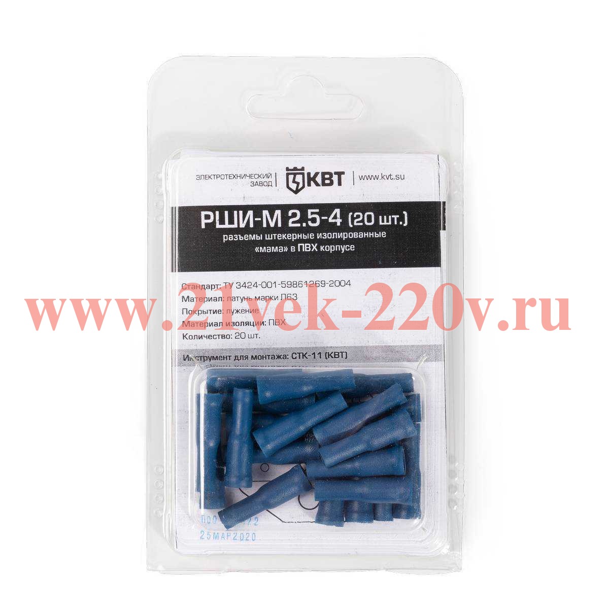 Разъём штекерный изолированный «мама» РШИ-М 2.5-4 (20 шт) с ПВХ манжетой в мини-упаковке SKU, РШИ-М 2.5-4 (20 шт.). Монтаж быстроразъемных соединений многопроволочных гибких медных проводов сечениями от 1.5 до 2.5 мм2 методом опрессовки.