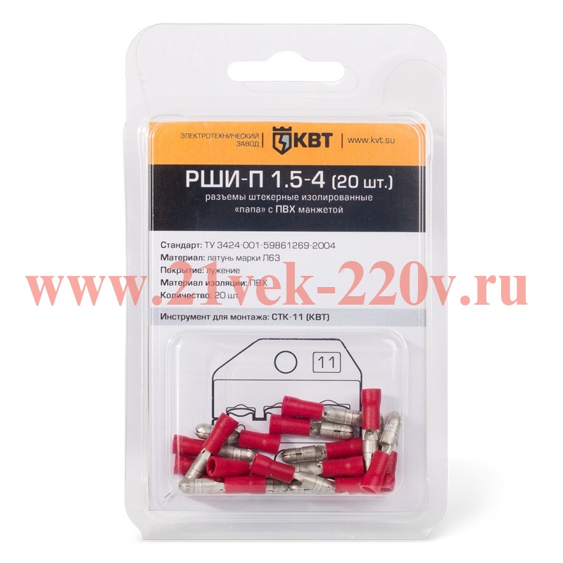 Разъём штекерный изолированный «папа» РШИ-П 1.5-4 (20 шт) с ПВХ манжетой в мини-упаковке SKU, РШИ-П 1.5-4 (20 шт.). Монтаж быстроразъемных соединений многопроволочных гибких медных проводов сечениями от 0.5 до 1.5 мм2 методом опрессовки.