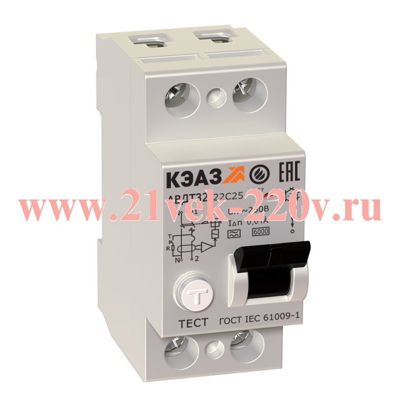Двухмодульный дифференциальный выключатель с защитой от сверх токов КЭАЗ АВДТ32, ток нагрузки 20А, ток утечки 30мА, ПКС 6кА, тепловая характеристика С, тип А.