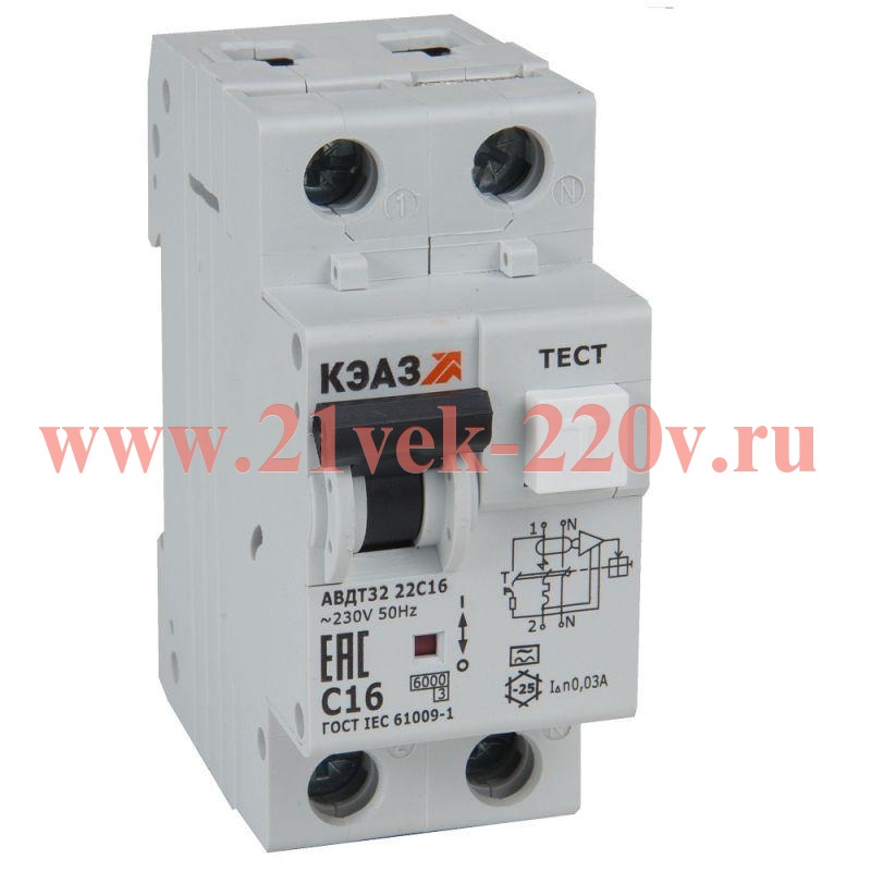 Двухмодульный дифференциальный выключатель с защитой от сверх токов КЭАЗ АВДТ32, ток нагрузки 6А, ток утечки 30мА, ПКС 6кА, тепловая характеристика С, тип А.