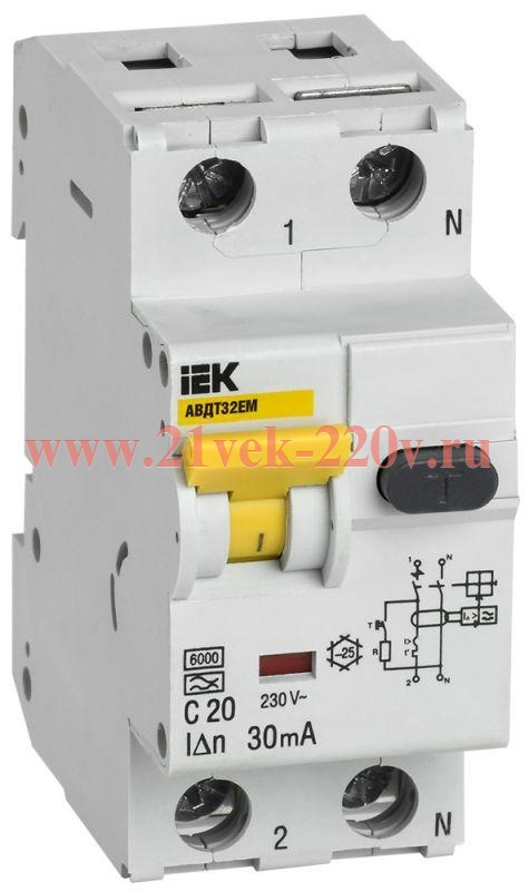 Двухполюсный дифавтомат, с характеристикой C, номинальным током 20 Ампер, 30 мА, ИЭК