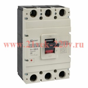 Выключатель автоматический ВА-99М 630/500А 3P 50кА EKF PROxima. Выключатель ВА-99М выполнен в виде моноблока и состоит из основания и крышки с фальшпанелью, в которой имеется окно для рукоятки управления и толкатель кнопки «Тест» - проверки механизма отключения выключателя. Основание выполнено из термостойкой пластмассы, не поддерживающей горение и являющейся несущей конструкцией для присоединительных зажимов, неподвижных и подвижных контактов с системой дугогашения, механизма управления, блока защиты от сверхтоков. Крышка закрывает все подвижные элементы механизма управления и внутренние токоведущие части. Система дугогашения выключателей весьма эффективна в исполнениях ВА-99M 125/125А и ВА-99M 160/160А и состоит из дугогасительных решеток со стальными никелированными дугогасительными вкладышами в исполнении ВА-99M 25/250А и выше применены дополнительные рассеиватели дуги в виде толстых стальных перфорированных пластин, вставленных в крышку. Тем не менее при установке выключателей в замкнутый объем распределительных устройств необходимо учитывать возможность выброса вверх на расстояние до 30 мм продуктов горения дуги в случае срабатывания защиты от сверхтока. Подключение проводов или шин со стороны источника питания производят на верхние зажимы выключателей с помощью болтов или зажимов, входящих в комплект поставки. Провода или шины к потребителю подключают на нижние зажимы. Возможна коммутация алюминиевым и медным проводником.