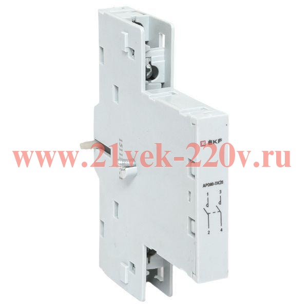 Дополнительный аксессуар для автомата пуска (защиты) двигателя. Блок с двумя парами нормально разомкнутых (НО/NO) контактов. Обе пары контактов замыкаются при включении АПД. Используется когда нужно продублировать сигнал "ВКЛ" или управлять двумя разными цепями одновременно (например, сигнальная лампа). Устанавливается на АПД сбоку (справа). Используется для АПД-80.