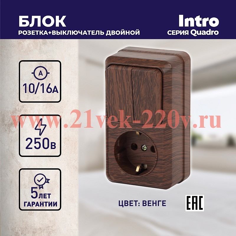 Описание | Блок розетка с выключателем Intro Quadro 2-706-10 двойным вертикальный 10(16)А-250В, IP20, ОУ, венге | |