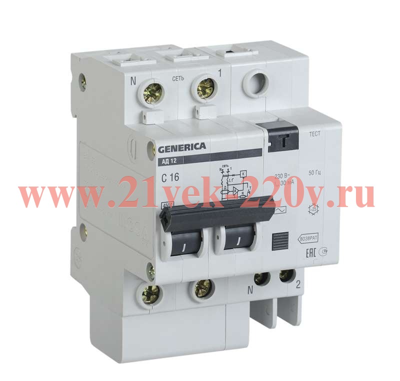 Дифавтомат серии Generica производства ИЭК представляет собой защитное устройство, в котором сочетаются функции автоматического выключателя и УЗО. Главным достоинством АВДТ данной серии является надежность и разумная стоимость. Он имеет типоразмер АД12, что означает наличие двух защищенных полюсов от сверхтоков. Данная модель служит для защиты электросети от возникающих перегрузок, коротких замыканий и тока утечки. Ее применение допустимо в однофазных сетях переменного тока с напряжением 230 Вольт и частотой 50 Герц. Агрегат класса АС эксплуатируется при типовых нагрузках и защищает от синусоидального переменного тока утечки. Он рассчитан на нагрузку тока 16 Ампер и допустимый ток утечки 30 мАмпер. Предельная отключающая способность прибора составляет 4500 Ампер. Характеристика срабатывания от сверхтоков происходит по кривой C-типа. Подключение нагрузки допустимо проводником с максимальным сечением 25 кв мм и шиной pin. С лицевой стороны присутствует двухпозиционный рычаг и кнопка «Возврат». Наличие кнопки «Тест» помогает регулярно производить проверку работоспособности аппарата. С помощью данного типа дифавтомата обеспечивается безопасность человека от поражения током при прямом или косвенном контакте. Габариты: ширина – 62,6 мм, высота – 87 мм, глубина – 78 мм.Уважаемые покупатели! На сайте указана розничная цена!!! По оптовым ценам и скидкам уточняйте у наших менеджеров по телефону 8(499)213-00-79. Также вы можете ознакомиться с этой информацией в прайс-листах.