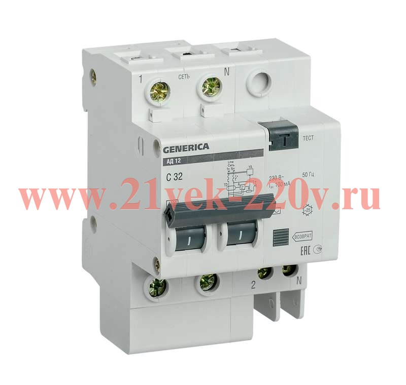 Дифференциальный автоматический выключатель класса АС серии GENERICA от производителя ИЭК представляет собой устройство со встроенной защитой от сверхтоков, которое используется в однофазных электросетях переменного тока с частотой 50 Герц и напряжением до 230 Вольт. Агрегат выполняет защитную функцию и обеспечивает 3 типа защиты: от короткого замыкания, перегрузок и утечки тока. Принцип действия: обнаружение дифференциального тока, сравнение с током срабатывания и отключение защищаемой цепи при превышении заданного значения. Данная модель рассчитана на токовую нагрузку 32 Ампера и обладает чувствительностью в 100 мАмпер. Она создана для предотвращения причин возникновения пожаров из-за нарушений в электропроводке. Дифавтомат обладает высокой отключающей способностью в 4,5 кАмпера и уставкой типа C. Компактный прибор с 2-мя защищенными полюсами 2Р крепится на DIN-рейку. На лицевой части есть тестовая кнопка для периодической проверки работоспособности дифавтомата, а также рукоятка управления с 2-мя позициями и кнопкой «Возврат», служащей индикатором срабатывания по дифференциальному току. Аппарат класса АС защищает только от синусоидальных переменных токов утечки и применяется для типовых нагрузок. Областью применения выступают распределительные щиты и силовые установки на объектах гражданского строительства. Габаритные параметры: ширина – 62,6 мм, высота – 87 мм, глубина – 78 мм.Уважаемые покупатели! На сайте указана розничная цена!!! По оптовым ценам и скидкам уточняйте у наших менеджеров по телефону 8(499)213-00-79. Также вы можете ознакомиться с этой информацией в прайс-листах.