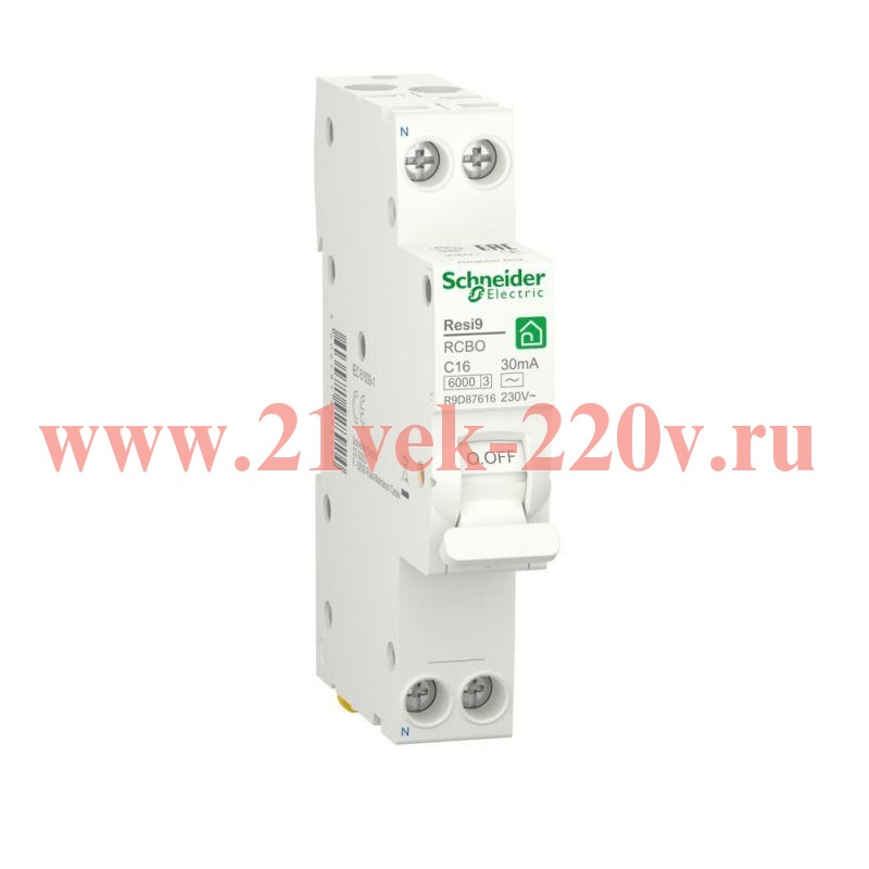 Дифавтомат серии Resi9 известной торговой марки Schneider Electric представляет собой защитное устройство в одномодульном корпусе, предназначенное для защиты электрической сети от возникающих перенапряжений, коротких замыканий и тока утечки. Его применение допустимо в однофазных электросетях переменного тока с напряжением 230 Вольт и частотой 50 Герц. АВДТ типа AC используется для типовых нагрузок и крепится на DIN-рейку простым защелкиванием. Дифавтомат рассчитан на предельную нагрузку тока 16 Ампер и допустимый ток утечки 30 мАмпер. Максимальная отключающая способность прибора составляет 6000 Ампер. Характеристика срабатывания электромагнитного расцепителя относится к типу C. Особенностью модели является электромеханическое устройство, которое сработает даже при обрыве N-проводника. Подключение нагрузки может быть произведено сверху или снизу. Компактный аппарат имеет 2 полюса, 1 из которых надежно защищен. На передней панели присутствует двухпозиционный рычаг управления с индикацией срабатывания. Наличие тестовой кнопки позволяет регулярно проверять работоспособность АВДТ. С помощью него обеспечивается безопасность человека от поражения током при прямом контакте. Параметры дифавтомата:ширина – 18 мм;высота – 93 мм;глубина – 70 мм;вес – 136 г.| Род тока: | Переменный ток (AC) |