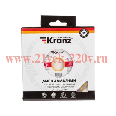 Диск алмазный отрезной Turbo KRANZ предназначен для сухой резки строительных материалов, таких как природный и искусственный камень, армированный бетон, кирпич, керамика. Используется в угловой шлифовальной машине, ручном электрическом плиткорезе, штроборезе.