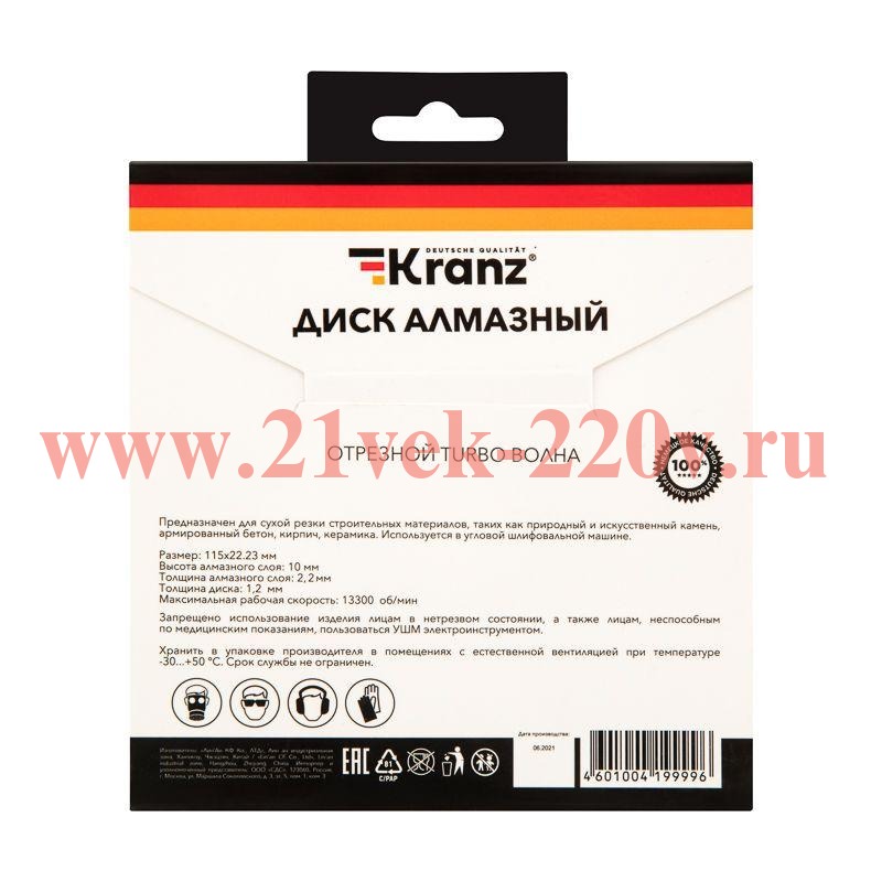 Диск алмазный отрезной Turbo волна 115x22.2 мм KRANZ предназначен для сухой и влажной резки строительных материалов, таких как природный и искусственный камень, армированный бетон, кирпич, керамика.