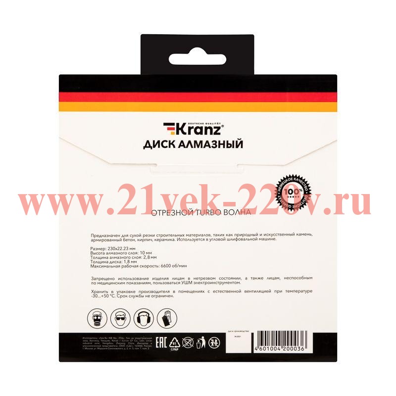 Диск алмазный отрезной Turbo волна 230x22.2 мм KRANZ предназначен для сухой и влажной резки строительных материалов, таких как природный и искусственный камень, армированный бетон, кирпич, керамика.