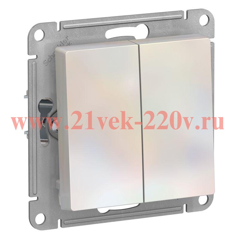 Двухклавишный выключатель света без подсветки из серии изделий Атлас Дизайн от французской компании Шнайдер Электрик используется для электросети с номинальной силой тока 10 Ампер и напряжением 220 Вольт. Данное изделие используется для установки в помещениях с двумя контурами освещения, которые предназначены для отдельного включения/выключения (люстра, различные точечные светильники и пр.)Данное изделие встраиваемое, фиксируется в специальном углублении при помощи раздвижных лапок разжимающихся с помощью винтов. Также выключатель может крепиться при помощи упорной пластины, которая прикрывается декоративной планкой.Двухклавишный выключатель – это идеальный вариант для установки в гостиничных номерах, офисах, больничных палатах и других помещениях.Краткие характеристики изделия.Тип – включатель с подсветкой.Номинальная сила тока – 10 Ампер.Номинальное напряжение сети – 220 ВольтМатериал – термопластик.Цвет кнопки и рамки - жемчуг.Подсветка – светодиод.Габариты – 71х71х35.5 мм.Крепление - лапки разжимные.Защита – степень IP20.Изготовитель - Schneider Electric.Механизм Schneider Electric AtlasDesign (цвет жемчуг) выключателя 2-клавишного подходит для сетей 250 В, на ток 10 А.- Двухклавишный выключатель позволяет управлять двумя источниками света с одной точки.- Лицевые детали из качественного ABS-пластика, устойчивого к царапинам и УФ-излучению.- Усиленные прямые монтажные лапки для лучшей фиксации механизма в монтажной коробке.