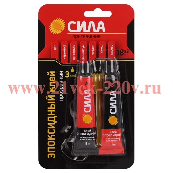 Эпоксидный клей СИЛА предназначен для соединения в различных сочетаниях металлов (железо, алюминий, медь, цинк), дерева, ДСП, бетона, керамики, линолеума, оргстекла и других материалов. Может применяться для заполнения мелких трещин, сколов и других объёмных повреждений, так как обладает хорошей текучестью и быстрым затвердеванием (время кристаллизации смеси - не более 3 минут). Инструкция по применению: 1. Очистите, высушите и обезжирьте склеиваемые поверхности. 2. Выдавите из тюбиков одинаковое количество компонентов A и B. 3. Тщательно перемешайте компоненты клея шпателем. В качестве сосуда для смешивания можно использовать пластиковую часть упаковки блистера. 4. Нанесите клей на склеиваемые поверхности, соедините их друг с другом и зафиксируйте в неподвижном состоянии на 3-5 минут.