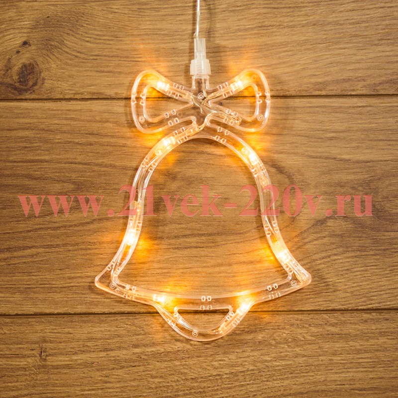 Фигура светодиодная выполнена из пластикового короба в форме "Колокольчика" внутри которого равномерно расположены 8 светодиодов теплого белого цвета свечения. Фигура крепится на ровную гладкую поверхность на присоску, которая расположена на батарейном блоке на расстоянии 20 см от фигуры на подвесе. Питание осуществляется при помощи 3 батареек типа AAA.