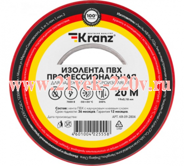 Изолента ПВХ профессиональная 0.18х19мм 20м красн. Kranz KR-09-2804