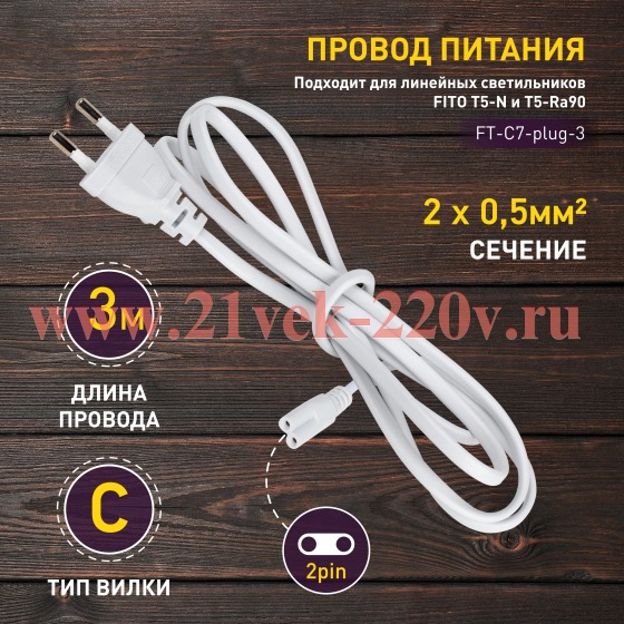 Кабель питания для линейного светильника ЭРА FT-С7-plug-3 , фитосветильника 3 м