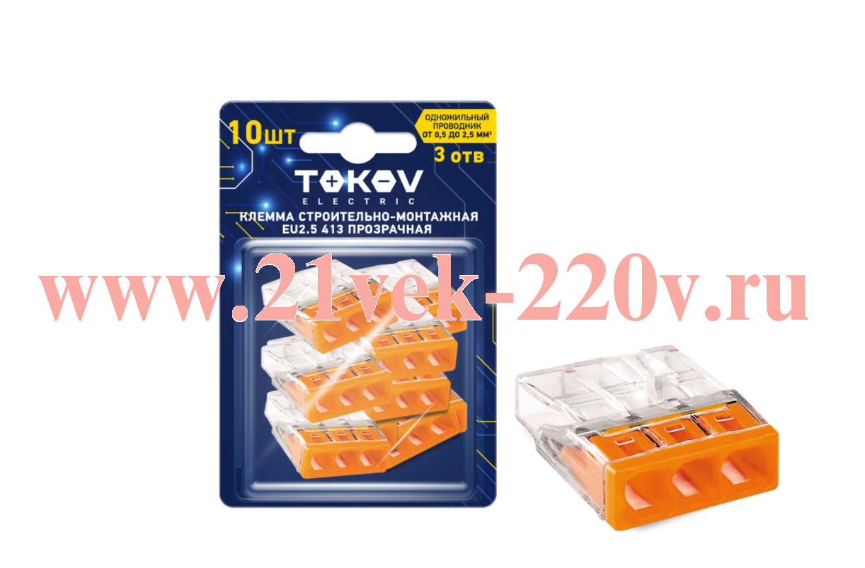 Клемма строительно-монтажная EU2.5 413 прозр. 3 отверстия (блист.10шт) TOKOV ELECTRIC TKE-EU2.5-413