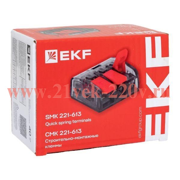 Клеммы СМК-221 EKF стали результатом развития классической серии СМК-222 и выделяются на российском рынке своим уникальным дизайном. Изделия предназначены для присоединения и ответвления одножильных и многожильных проводов сечением до 6 мм2 в цепях переменного тока до 400В. Клеммы СМК-221 отличаются повышенной прочностью и рассчитаны на многократное использование. Кроме того, новые клеммы можно использовать при температуре от –40 до +40° C и относительной среднегодовой влажности 60% при температуре 20° C. Новые надежные клеммы СМК-221, которые заметно облегчают процесс монтажа проводки, предназначены для электриков и строителей. Во избежание перегрева в одну клемму предусматривается подключение проводов одного сечения.