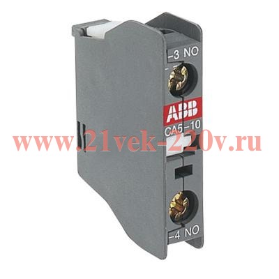 Дополнительный фронтальный однополюсный контактор СА5-10 с одним открытым контактом фирмы ABB серии А на 3 Ампера с режимом работы АС3 и напряжением на катушке 220 Вольт для контакторов серий А9-А110.