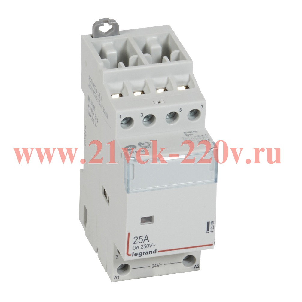 Модульный контактор с катушкой 24 Вольта серии CX3 от производителя Legrand представляет собой силовое реле, применяемое в цепях управления электроустановок общественных и жилых зданий для дистанционной коммутации различного электрического оборудования. Оно широко применяется для управления освещением, включением вентиляции, запуском мощных электродвигателей и других устройств. Данная модель изделия не имеет ручного управления и обладает шириной 2 модуля = 35,6 мм. Это четырехполюсный аппарат, который рассчитан на токовую нагрузку до 25 Ампер при напряжение сети переменного тока 400 Вольт. Он состоит из электромагнитной системы, дугогасительной камеры и системы контактов комбинированного типа: 2 замыкающих и 2 размыкающих. Устройств крепится на ДИН-рейку шириной 35 мм или симметричную монтажную рейку EN 60.715 в любом рабочем положении. Материалом изготовления корпуса является полиамид, который обладает повышенной прочностью и не поддерживает горение. Степень защиты от прикосновения IP3XD и степень защиты от ударов IK04 обеспечивают электробезопасность и долговечный срок службы изделия. Это прибор, который обладает эргономичным дизайном, удобен в эксплуатации и легко монтируется в распределительный щит.