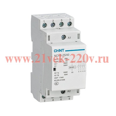 Модульные контакторы NCH8 предназначены для управления нагрузками в сетях переменного тока напряжением до 400В и частотой 50/60 Гц с номинальным током до 63 А. Они применяются в качестве устройства для дистанционного управления нагрузками, эксплуатирующимися в категориях применения AC-7b и AC-7a (не индуктивная нагрузка или нагрузка с малой индуктивностью / резистивные электропечи, бытовые приборы и аналогичные потребители). Контакторы не предназначены для отключения токов короткого замыкания, поэтому их следует использовать в комплекте с соответствующим аппаратом защиты.