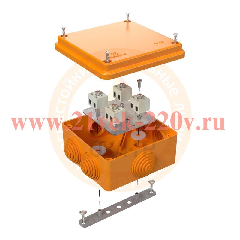 Коробка распределительная огнезащитная входит в состав огнестойких кабельных линий компании Промрукав и представляет собой пластиковый бокс оранжевого цвета, который оснащен крышкой и 6 вводами для кабелей. Он используется при прокладке систем противопожарной безопасности по стенам и потолкам зданий. Конструкция из двух стальных пластин позволяет надежно крепить его к поверхности. Основное назначение коробки состоит в механической защите мест соединения проводов и кабелей, а также для предотвращения попадания пыли, влаги и посторонних предметов внутрь. Она имеет открытый тип установки, поэтому обладает надежной степенью защиты IP55. Мембранные сальники на вводах с диаметром 25 мм служат для герметичности подвода проводов. Коробка имеет 6 полюсов на 3 керамических колодках для проводов сечением 2.5 мм. Ее установка допустима в сетях с рабочим напряжением до 750 Вольт. Материалом коробки является безгалогенный полимер, который имеет высокую стойкость к воспламенению от нагретой проволоки. Предел огнестойкости составляет Е15-Е120, что означает время работы линии в условиях пожара, необходимого для эвакуации людей в безопасную зону. Размеры коробки: 100х100х50 мм. Температура эксплуатации: -25 до 40 градусов Цельсия.Уважаемые покупатели! На сайте указана розничная цена!!! По оптовым ценам и скидкам уточняйте у наших менеджеров по телефону 8(499)213-00-79. Также вы можете ознакомиться с этой информацией в прайс-листах.