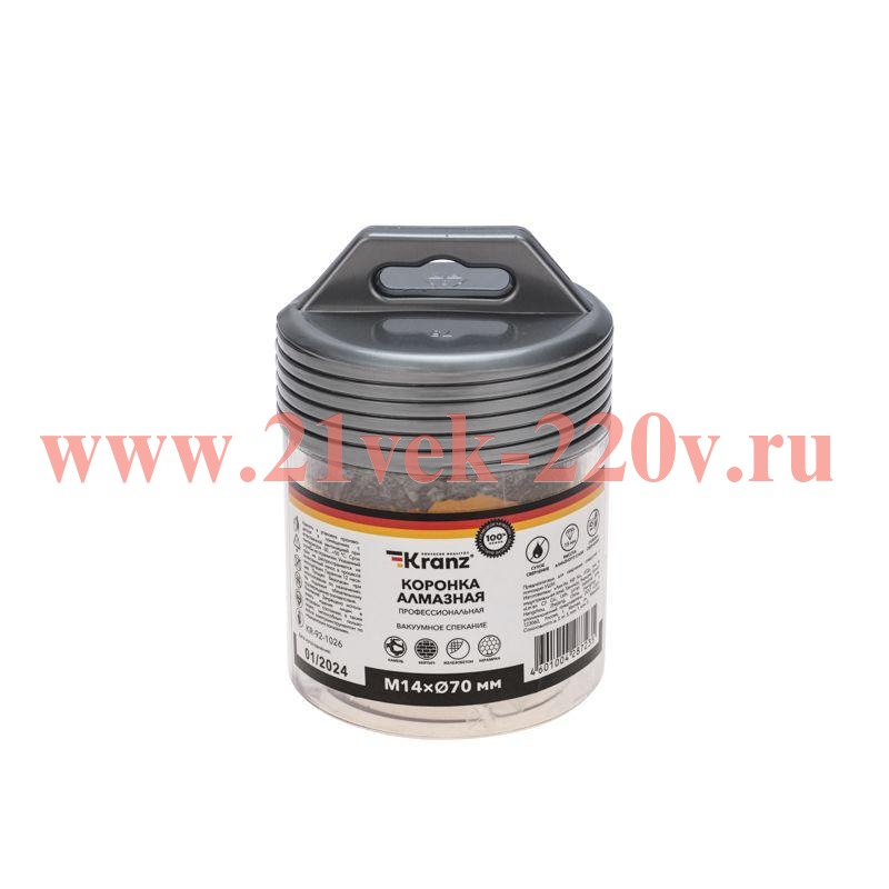 Высокоскоростная алмазная коронка предназначена для сверления отверстий в различных материалах, включая керамогранит, камень, керамику, бетон, кирпич и листовой металл, дерево и их комбинации. Она легко крепится к угловой шлифовальной машине (УШМ) с помощью резьбы М14 и работает в режиме безударного сверления.Технология высокотемпературного вакуумного спекания алмазов позволяет сверлить самые твёрдые материалы без водяного охлаждения. Высота алмазного слоя составляет 15 мм, а максимальная глубина сверления — 45 мм. Особенности коронки включают высокую плотность и равномерное распределение алмазов на рабочей кромке, что гарантирует эффективность работы и долгий срок службы инструмента.