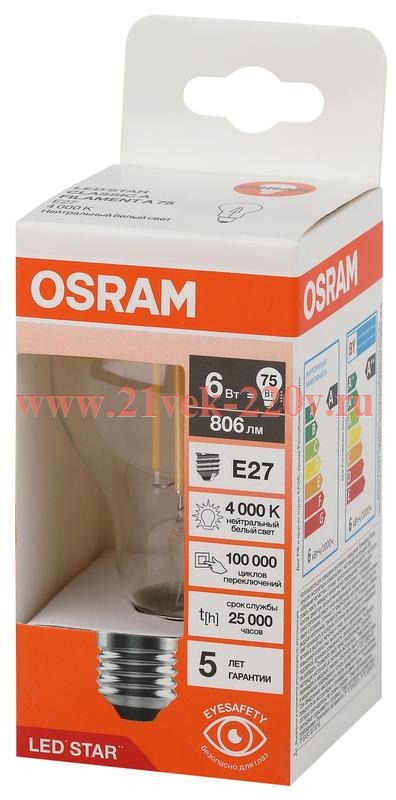 Филаментная лампочка формы груша с нитевидными светодиодами Осрам мощностью 6 Ватт, с цоколем E27, нейтральный белый свет, прозрачная колба
