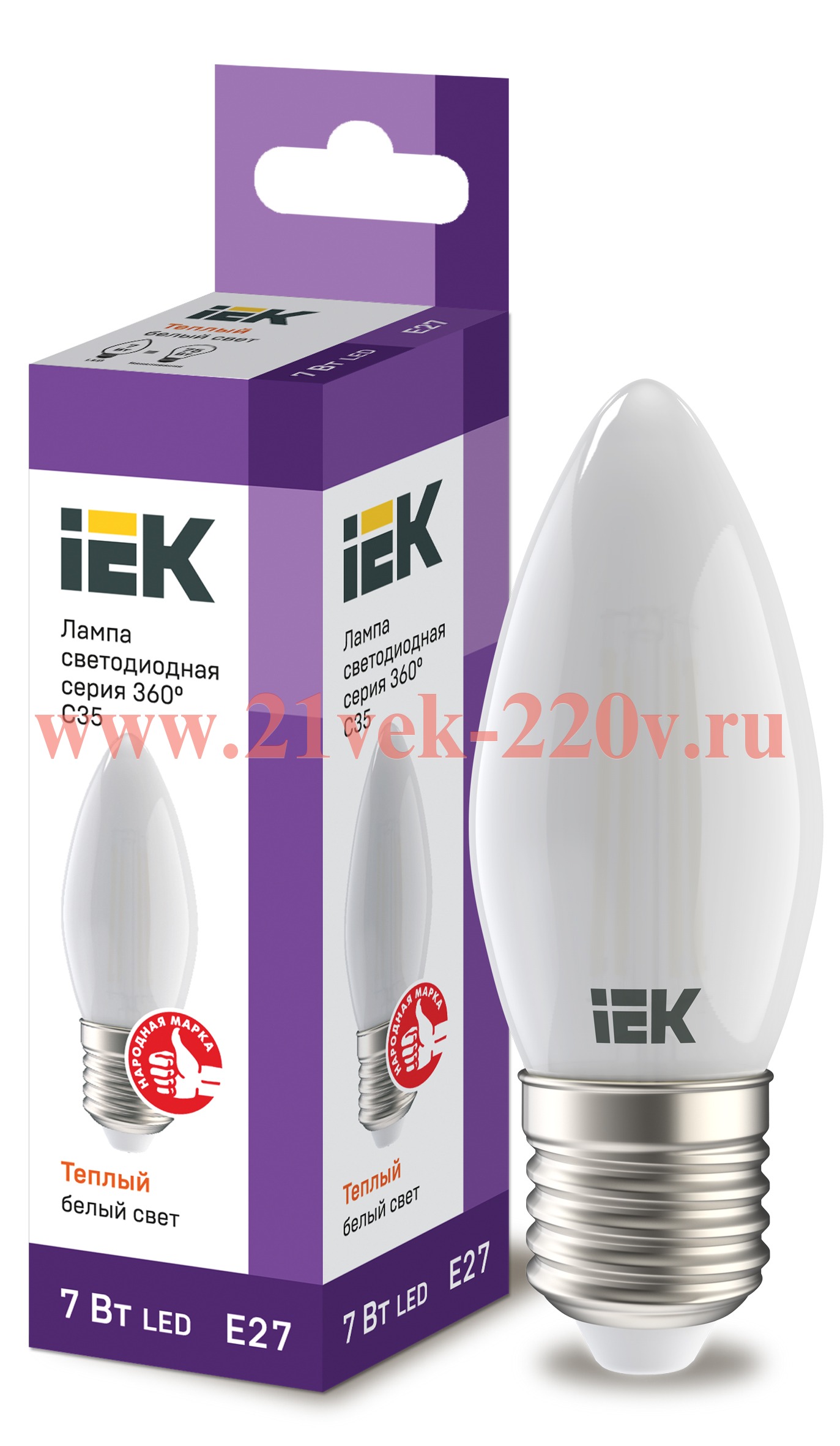 Филаментная лампочка свеча С35 ИЭК, 7 Вт, матовая колба, теплый свет
