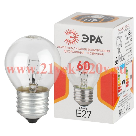 Лампа накаливания P45 60Вт шар прозрачная E27/E27 230В Эра