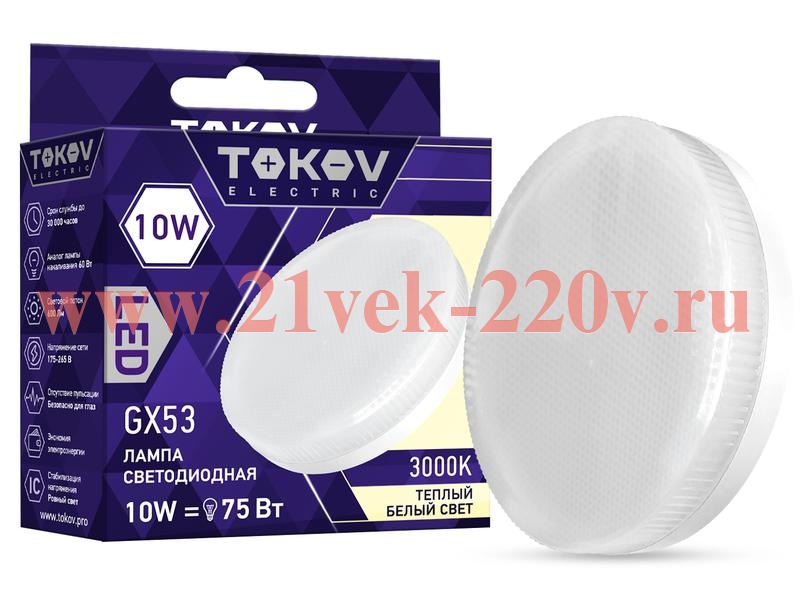Лампа светодиодная 10Вт Tablet 3000К GX53 176-264В TOKOV ELECTRIC TKE-GX53-10-3K