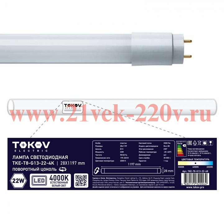 Лампа светодиодная 22Вт линейная T8 4000К G13 176-264В TOKOV ELECTRIC TKE-T8-G13-22-4K