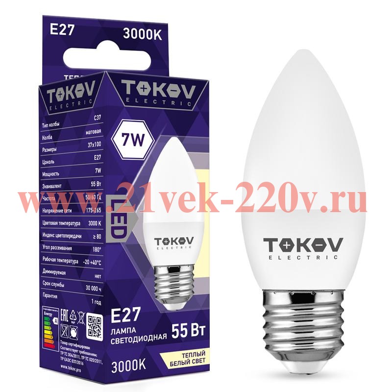 Лампа светодиодная 7Вт С37 3000К Е27 176-264В TOKOV ELECTRIC TKE-C37-E27-7-3K