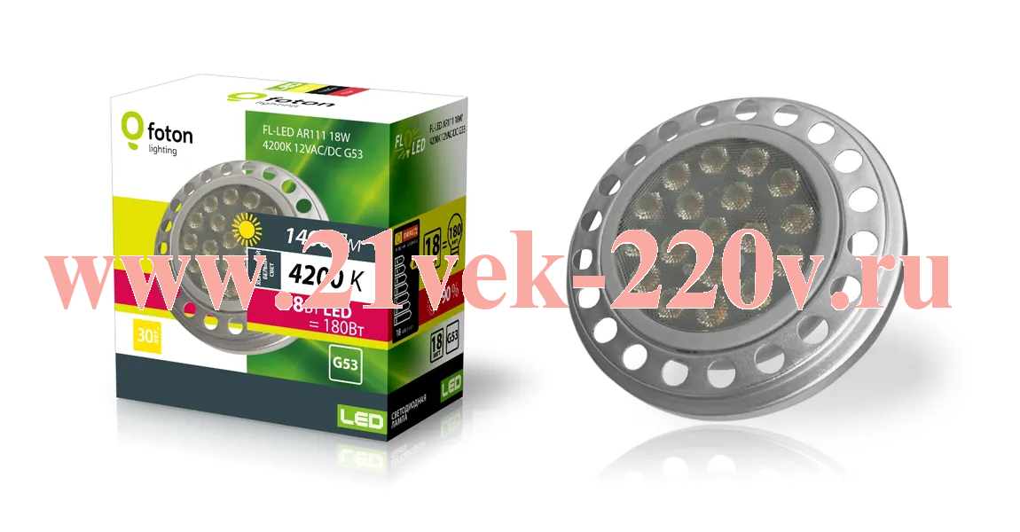 Светодиодная лампа FOTON FL-LED AR111 18W 30° 4200K 12VAC/DC G53 мощностью 18 Ватт с цоколем G53 нейтрального белого света.