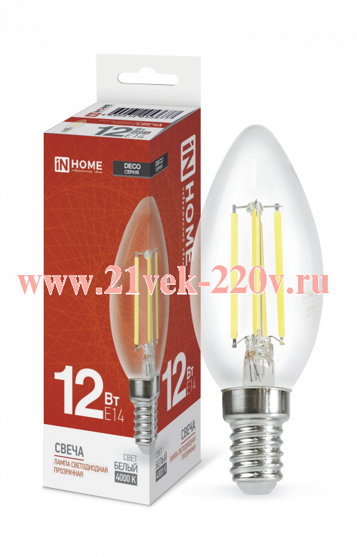 Лампа светодиодная LED-СВЕЧА-deco 12Вт 230В E14 4000К 1350лм прозрачная IN HOME