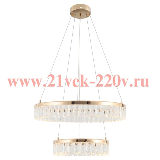 Дизайнерская двухъярусная LED-люстра Rivoli Erika (арт. 6131-105) с оригинальными хрустальными элементами — элегантное современное решение для интерьера, которое гармонично сочетает стиль и функциональность. Мощность люстры составляет 68 Вт, а её два плафона-кольца, выполненные в золотистом оттенке, создают мягкое и уютное освещение благодаря встроенным светодиодам, излучающим тёплый белый свет (3000 К). Диаметр люстры 500 мм, что делает её идеальной для просторных помещений, а два яруса плафонов придают люстре объём и выразительность. Главная декоративная особенность — изысканные хрустальные подвески с уникальной гравировкой по стеклу, которые добавляют блеска и роскоши, превращая люстру в центральный акцент любого интерьера.