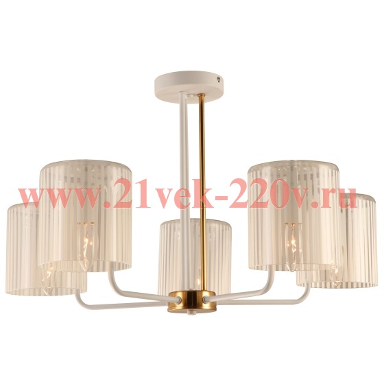 5-рожковая люстра на двух штангах – белого и золотого цветов. Плафоны люстры на потолок Rivoli Evonne (арт. 2088-305) изготовлены из стекла с чередованием прозрачных и матовых участков. Дизайнерскую коллекцию Evonne в классическом стиле дополняют люстры 7-рожковые (арт. 2088-307) и настенное бра (арт. 2088-401). Люстра Evonne c 5 стеклянными плафонами качественно освещает до 15 м2 площади жилого пространства. Эту модель стоит купить в качестве основной люстры в гостиную, люстры в спальню. Такая дизайнерская люстра даст много света и поможет создать неповторимый интерьер. Источники света для данной люстры – Е14 40 Вт (5 ламп).