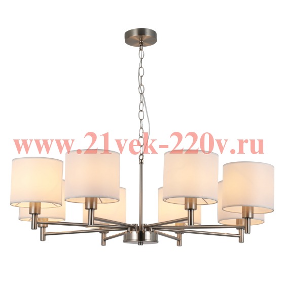 Подвесная люстра Marilyn 2091-308 от итальянской фабрики Rivoli подходит для размещения в гостиной, на кухне, над обеденным столом, в прихожей и коридоре, в спальне, в зале, в классическом стиле. Материал изготовления – металл, цвет никель. Модель имеет 8 абажуров (ткань). Цоколь 8xE14. Освещаемая площадь до 16 кв. м. Мощность 320 W, питание от сети 220 V, cтепень защиты от влаги и пыли IP20. Габариты: длина – 79 см, ширина – 79 см, высота – 64 см, крепление на монтажную пластину. Технические особенности: регулировка по высоте.