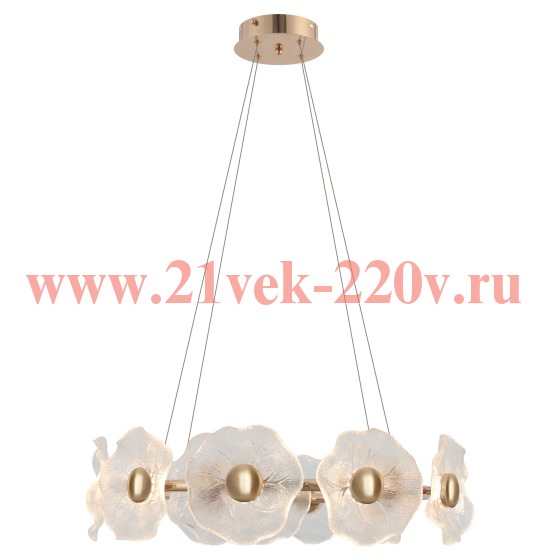 Оригинальную дизайнерскую коллекцию Rivoli Shannon представляют: светодиодная люстра (арт. 6135-101) и светодиодный светильник-бра (арт. 6135-401). Отличительной особенностью этой нежной элегантной коллекции от европейских дизайнеров стали прозрачные стеклянные плафоны в виде распустившихся цветков. Цветы из высококачественного стекла выполнены филигранно и реалистично, повторяя форму, изгибы и узоры живых соцветий. Встроенные светодиоды последнего поколения создают мягкое тёплое свечение с цветовой температурой 3000 К. Арматура коллекции окрашена в красивый золотой оттенок. Данная модель коллекции — подвесная LED-люстра мощностью 30 Вт. Диаметр кольцевого металлического абажура люстры — 670 мм. Световой поток — 2250 Лм. Это яркая большая люстра для просторных комнат и общественных пространств.