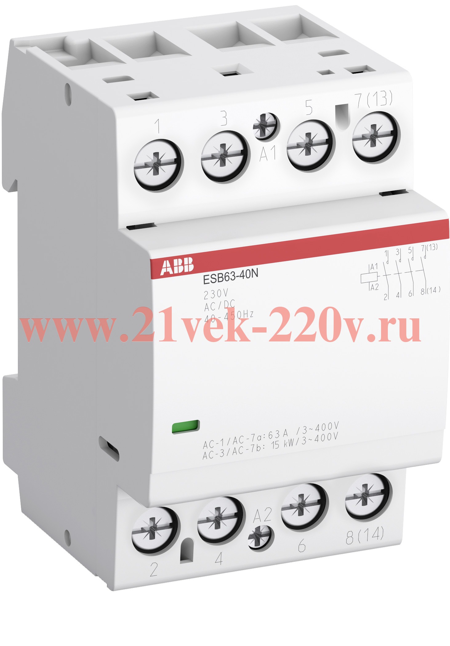 ABB Контактор ESB63-40N-06 модульный (63А АС-1, 4НО), катушка 230В AC/DC Характеристики Производитель : ABB Степень защиты (IP) :IP20 Номин. раб. напряжение :220.0...400.0 Глубина установочная (встраив.) :58 Возможна дополнит. комплектация :0 Тип напряжения (раб. напряжение) :AC/DC (перемен./постоян.) Количество нормально закрытых контактов (НЗ) :0 Количество нормально открытых контактов (НО) :4 Напряжение цепи управления :230 Номинальный рабочий ток :63 Тип напряжения (цепь управления) :AC/DC (перемен./постоян.) Слайдер для ручного переключения :0 Категория применения :7 Количество модулей (модульная ширина) :3