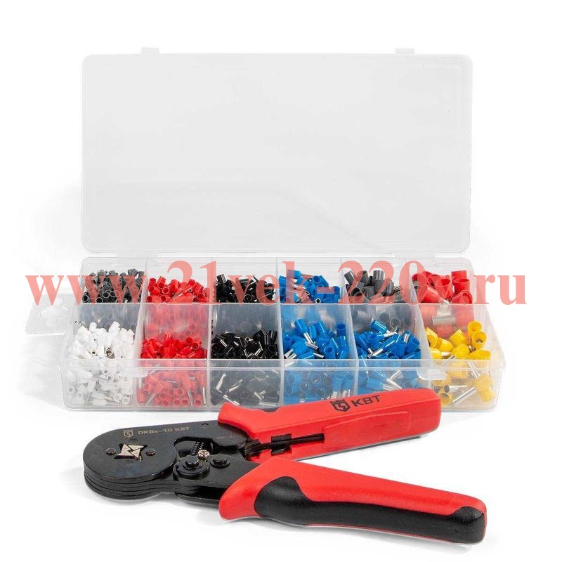 Набор втулочных наконечников НШВИ К-1200-1 SKU, КВТ. Оконцевание методом опрессовки гибких многопроволочных медных проводников сечениями от 0.5 до 10 мм2, трансформация концов многожильных проводов в монолитные штифты.
