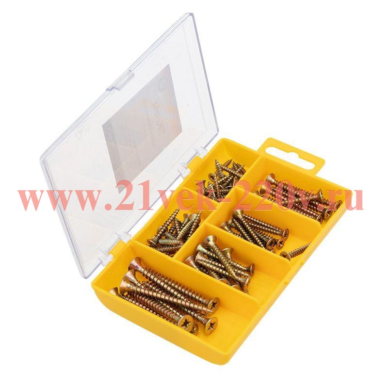Небольшой набор состоит из 76 саморезов для ДСП, которых хватит для выполнения базовых задач. Поставляется в пластиковом органайзере, который помогает не только удобно хранить изделия, но и быстро находить крепеж нужного размера. Органайзер может в дальнейшем использоваться для хранения других крепежных элементов.