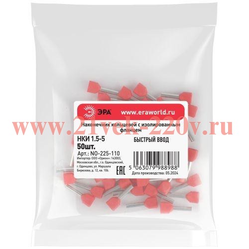 Наконечник-гильза ЭРА NO-225-100 двойной НШвИ(2) 1.0-10 с изолированным фланцем упаковка 50 шт