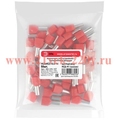 Наконечник-гильза ЭРА NO-225-107 двойной НШвИ(2) 10.0-14 с изолированным фланцем упаковка 50 шт