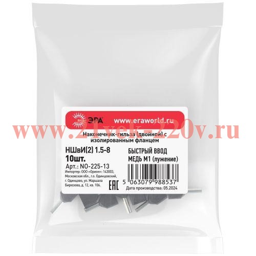 Наконечник-гильза ЭРА NO-225-13 двойной НШвИ(2) 1.5-8 с изолированным фланцем упаковка 10 шт